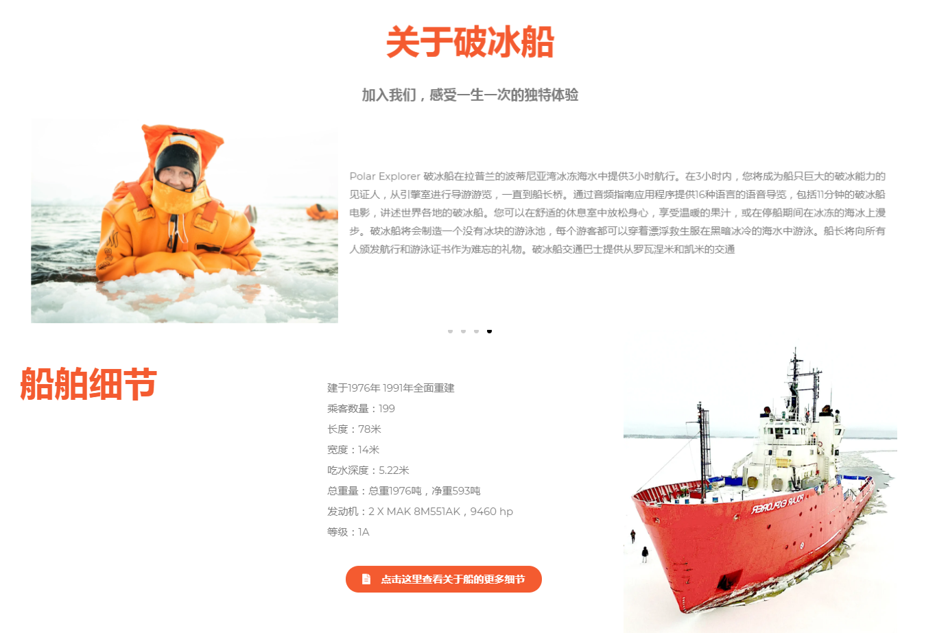 Polar Explorer Icebreaker建造于1976年,被誉为拉普兰地区至佳破冰船之一,长78米,宽14米,现可承载199人。Polar Explorer 破冰船在拉普兰的波蒂尼亚湾冰冻海水中提供3小时航行。在3小时内,您将成为船只巨大的破冰能力的见证人,从引擎室进行导游游览,一直到船长驾驶室。通过音频指南应用程序提供16种语言的语音导览,包括11分钟的破冰船电影,讲述世界各地的破冰船。您可以在舒适的休息室中放松身心,享受温暖的果汁,或在停船期间在冰冻的海冰上漫步。破冰船将会制造一个没有冰块的游泳池,每个游客(身高125cm以上可漂浮)都可以穿着漂浮救生服在黑暗冰冷的海水中游泳。